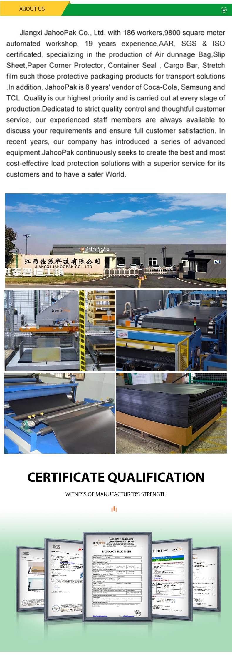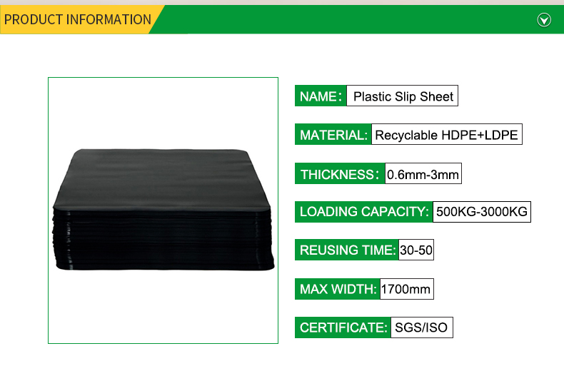 1Product nameslip sheet for transportation2ColorBlack, White, Green, Blue or other customized3UsageWarehouse & Transportation4CertificationSGS, ISO,etc.5Width of lipCustomizable6Thickness0.6~3mm or customized7Loading Weight300kg-3500kg8Special handlingAvailable (moistureproof)9OEM OptionYes10Drawing pictureCustomer offer / our design11TypesOne-tab slip sheet; two-tab slip sheet-opposite; two-tab slip sheet-adjacent; three-tab slip sheet; four-tab slip sheet.12Benefits1.Reduce the cost of material,freight,labour,repair,storage and disposal2.Environmentally-friendly, wood-free, hygienic and 100% recyclable3.Compatible with standard forklifts outfitted with push-pull attachments, rollerforks and morden conveyor systems4.Ideal for both domestic and international shippers13BTWFor the use of slip sheets all you need is a push/pull-device, which you can get from your nearest fork-lift truck supplier. The device is suitable for any standard fork-lift truck and the investment repays itself faster than you would think. You will get more free container space and save in han